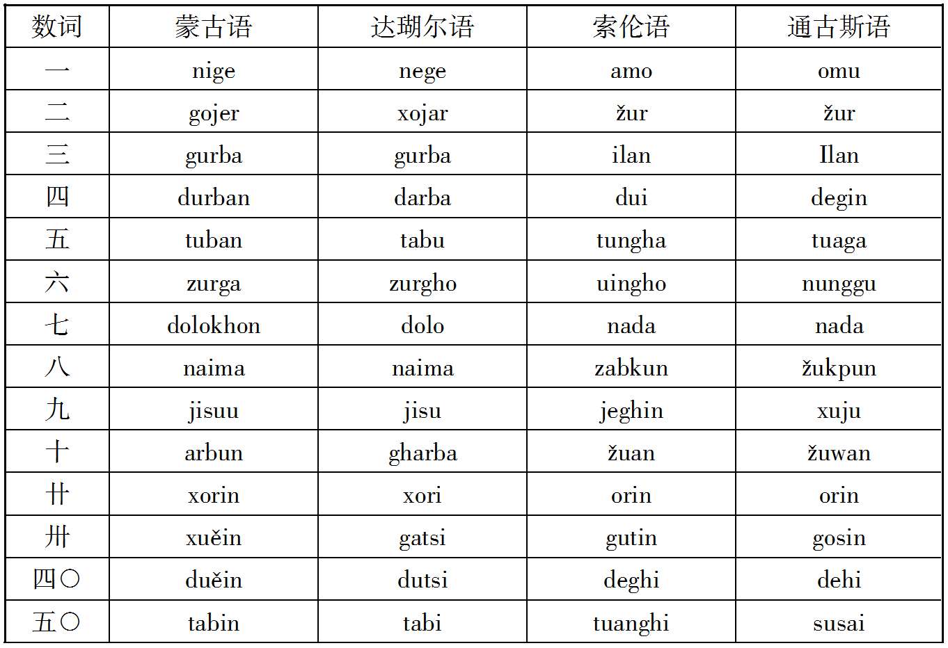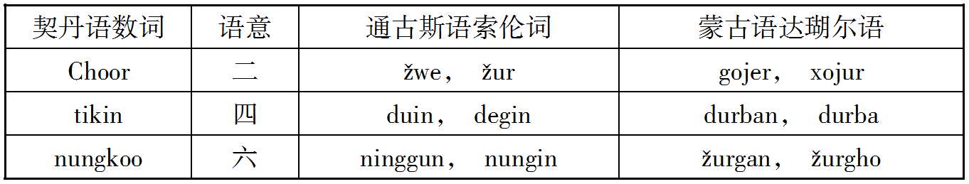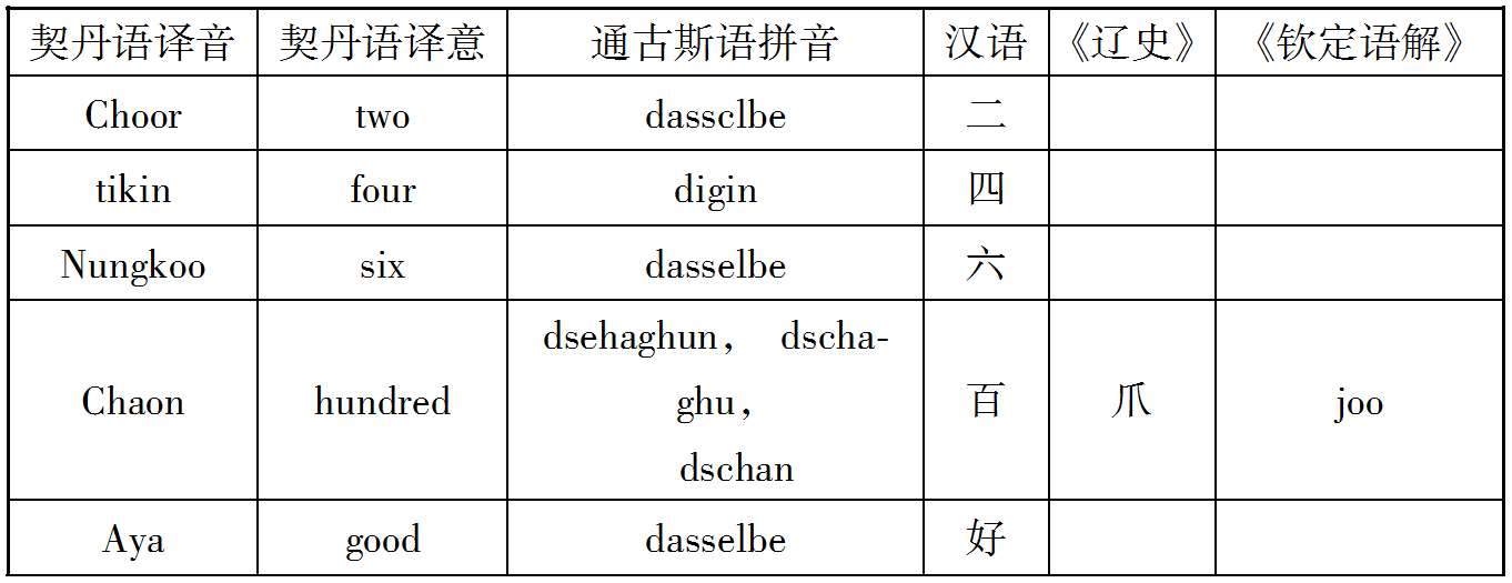 案Schott氏据上述契丹语三十余语中,有数词Choor(二)tikin(四)Nungkoo(六)三语与通古斯语相类似,故推定契丹民族与女真满洲族有密切关系(见Kitai und Karakitai p.6)。然Schott氏所据之契丹三十余语,自称得自曾著蒙古史之Howorth氏,而Howorth氏又得自俄国Palladins氏,至Palladins氏果由何处而得此三十余语,则全不明。今收此三十余语与《辽史》《辽史拾遗》《契丹国志》《钦定辽史国语解》等书中所见之契丹语比较之,则其相同或相类不过四分之一,其余则概不知其出处,此诚可怪之事也。