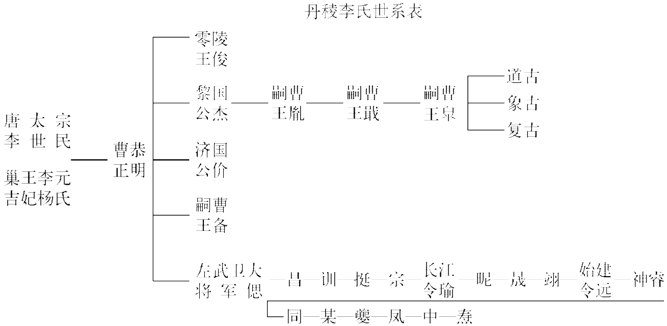 猷案:井研李氏世系不详,而丹稜李氏世系则有周必大所撰《李文简公神道碑铭》,《新唐书·宗室世系表》,《四川通志》,《眉州属志》,《丹楼县志》等书可资依据。然省志州志县志皆有不可不纠正之大误点二:一曰以李记为李臯之后,二曰系李瑜于天宝至德之间。夫李德为李明之季子,而李臯为李明之四世孙,据《唐书·宗室世系表》及诸王列传所载甚确,稍一检查即明,不审省志州志县志何以踵谬袭误至是?又以三十年为一世之标准计之,李瑜当生于唐文宗开成初年(公元八三六),即以二十五年为一世之标准计算,则李瑜亦当生于唐懿宗咸通初年(公元八六○),不知省州县志何以皆系瑜于天宝至德之间,相距凡百余年之久?案《唐书·宗室·曹王臯传》谓臯于天宝十一载嗣封,安禄山反,奉母逃民间,间走蜀,谒玄宗,由都水使者迁左领军将军,后累官至户部尚书,贞元八年卒。岂以李臯避安禄山之乱入蜀,与李偲避武后之害入蜀,混为一事耶?殊不知李臯虽曾一度入蜀,然终回长安,嗣王位,历高官。而李偲入蜀,则家于丹稜者也,故丹陵李氏为李偲之后,而非李臯之后,周必大撰《李文简公神道碑》,《唐书·宗室世系表》所载若可信,则省州县志所载皆误,故为订正如上表。