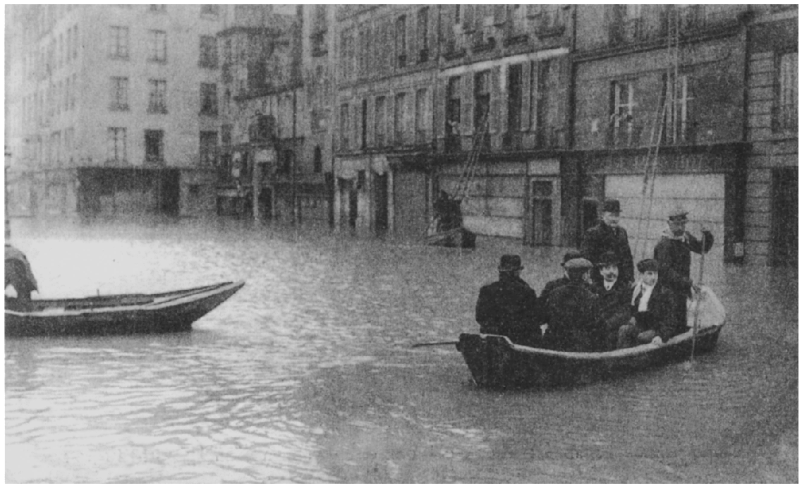 由于地铁在部分路段停运,巴黎市民不得不寻求其他出行方式。女士们在街道上蹚着水走,将长长的裙子提到膝盖位置(这种行为通常被认为不雅)。青年男子抓着行驶的汽车,脚踩着汽车的踏板,以避免脚被水打湿。小船开始在街道上穿梭,警察公开承诺,对于住在塞纳河附近的居民,如果需要,警察会用小船把他们送回家。