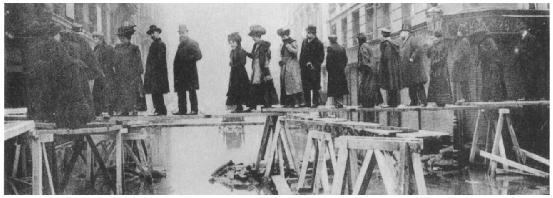 很快,伊西镇的很多小房子就被淹没在洪水之中,那是体力劳动者的居所。人们赶忙穿上衣服逃命,顾不上携带家什,就走进齐腰深的水里,艰难地离开自己的家。到了1月24日凌晨3点,也就是塞纳河决堤一个小时以后,在伊西镇地势最低的地方,洪水已经有6英尺多深。熟悉的街道,熟悉的标志,全都消失了。据胡伯特所言,在一条街道上,“人们只能看到一大片水,点缀着成行露出水面的树木、依然亮着的汽灯、几个屋顶以及有轨电车的电线杆”。电灯都熄灭了,饮用水供应也停止了。塞纳河的水侵入了老年公寓,厨房和洗衣机房都不能用了。住在底层的人很快就搬到楼上,因为地上的水还在不停地上涨。城镇里的很多工厂被迫关闭,很多人没有了工作,也不知道什么时候才能复工。胡伯特这样描述道:“他们忧郁的眼睛望着无边的大水,寻找着曾经为他们遮风避雨的简陋家园。” (15)