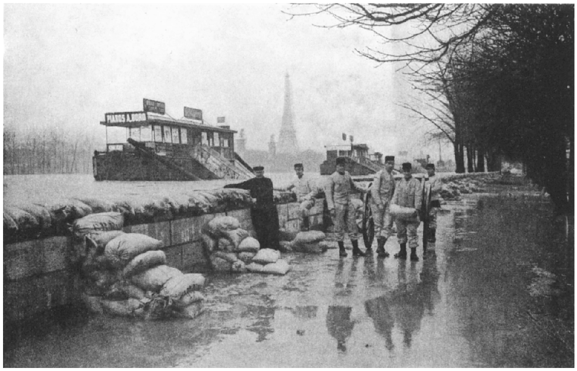 大量部队开始从全国各地抵达巴黎。从法国各地集结来的驻军,包括大约10个步兵营和15个工程兵连,现在部署在巴黎及其郊区,协助承担一直以来由巴黎要塞部队担负的救灾任务。让-巴普蒂斯特·达尔斯坦将军指挥法国的士兵和水手,以单人和团队的形式,在巴黎街区巡逻,确保城市的秩序和安全,向处于危险之中的市民提供救助。根据媒体的粗略估计,军方从巴黎城外的军事基地提供了至少3500匹马、200只船、300辆汽车、15000张宿营床,还有新到来的士兵随身携带的各种物品。 (25) 很快,在被洪水淹没的街道上到处都可看到士兵的身影,这成为巴黎市民熟悉的一道风景。