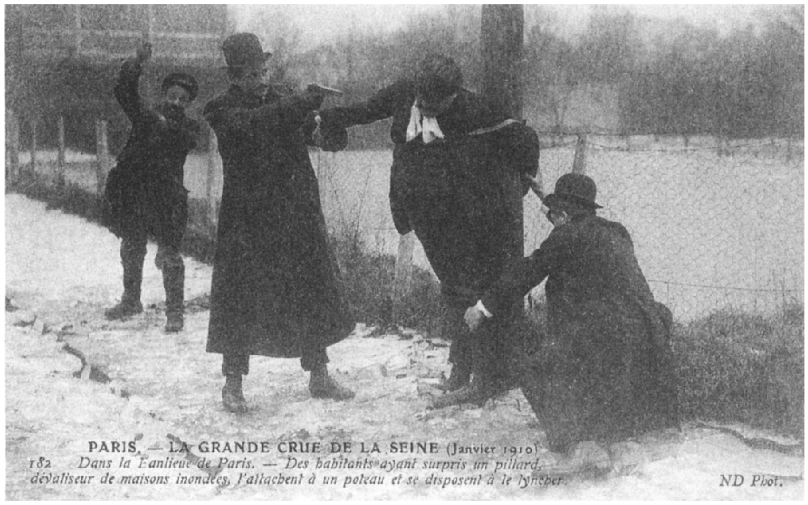 有一张明信片将新闻报纸上描述的情形形象化了。明信片上面描绘的是发生在伊夫里的一个真实故事,一名劫匪被愤怒的居民处以私刑。这幅照片很明显是有意摆拍的,主要是为了更好的照相效果。照片上一个男人戴着礼帽,将一名罪犯绑到电线杆子上,另一个男人用枪瞄准这名劫匪。但是,在持枪男人的后面,另一名小偷似乎是要攻击持枪男人。摄影师没有在照片中显示实际发生的暴力情形,也没有说明后来的情况,只是模拟了暴力“发生前”的画面。这幅照片没有给人提供劫匪抢劫和私刑处置的场面,只是表明这两种行为都是在洪涝中真实发生的。即使是一幅摆拍的照片,也一定让看过的人不寒而栗,使人想到洪涝发生前、发生期间以及发生后,在全城各地潜伏着的危险暴徒。