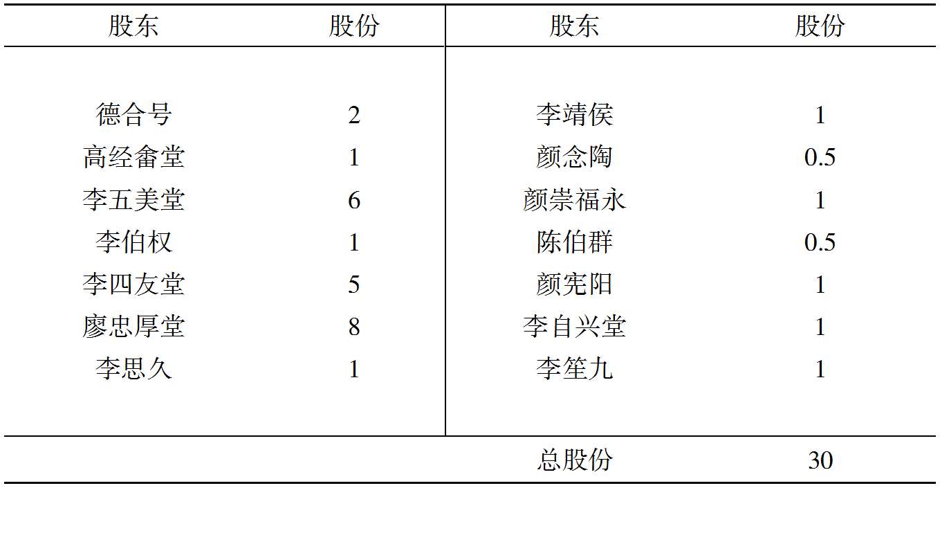 并非所有的协议都如此简单。当起实际作用的合伙人日益从他们最初所打的盐井离去,股份的分配变得越来越复杂。在清朝时,毛志远堂和高经畬堂,以德合号的名义,买下了莲海井并改名为天龙井。 (123) 他们拥有盐井的20股,而地主——寡妇袁罗氏及儿子们,似乎得到10股。1910年,德和号将股份转让给了他们的下节李五美堂——这是一个涉身盐井交易的家族堂,有数份契约保存至今。上节保留了4股,而下节拥有16股。1927年,他们又将所保留4股中的1股转让给了李伯权。李五美堂也从袁家手里买了5份地主股,这样股份总数达到21股。1927年,李五美堂将8股转让给了瘳忠厚堂,自己还剩13股。1928年,李五美堂将另外的8股转让给了似乎是秀洋灶的合伙人:李思九、李笙九、李靖侯、李五美堂、李自兴堂、颜念陶、颜崇福永(一个商号)、陈伯群。至此李五美堂有5下节股。表2.1开列了1933年该井见功时的股东。