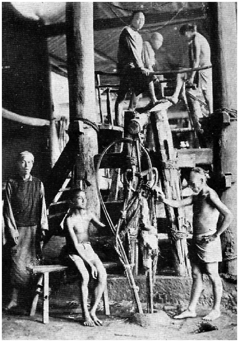 在富荣,对于技能和经验的要求、雇用的稳定性,以及工人动员的更高水平,这些将劳工分成三个层次。熟练的井、灶监工,就帝制晚期的标准衡量,报酬极高,在生产组织上被赋予了很多职责。在生产力和利润上升时期,他们也是除管理层外红利的主要受惠者。根据一位上岁数的锉井工人记述,像他们这样的熟练匠人可以将他们的专业工具和技能视为保障工作和优待的有利条件。他们极珍视行业秘密,一些匠人制造自己专用的工具,使用它们时不许旁观。少数的监工之下是大量的工人,他们的技能以及可以得到帮会的支持,为他们赢得了工作的保障和相对高额的工资。烧盐工人是这些人中最优越者,下面会讨论到他们的帮会。他们的收入是煤矿工人和非熟练盐业工人的2.5倍。各工种中最底层的是体力工人、打杂人员及大量临时工,他们实行计件工资,也没有伙食供应,一年到头仅做雇工无法维持生活。在20世纪初的一张照片中,没有技能的锉井工人和有技能的监管者站在钻井设备前面,人们一眼就可以看出其中地位和工资待遇的不同(见图片5.1)。