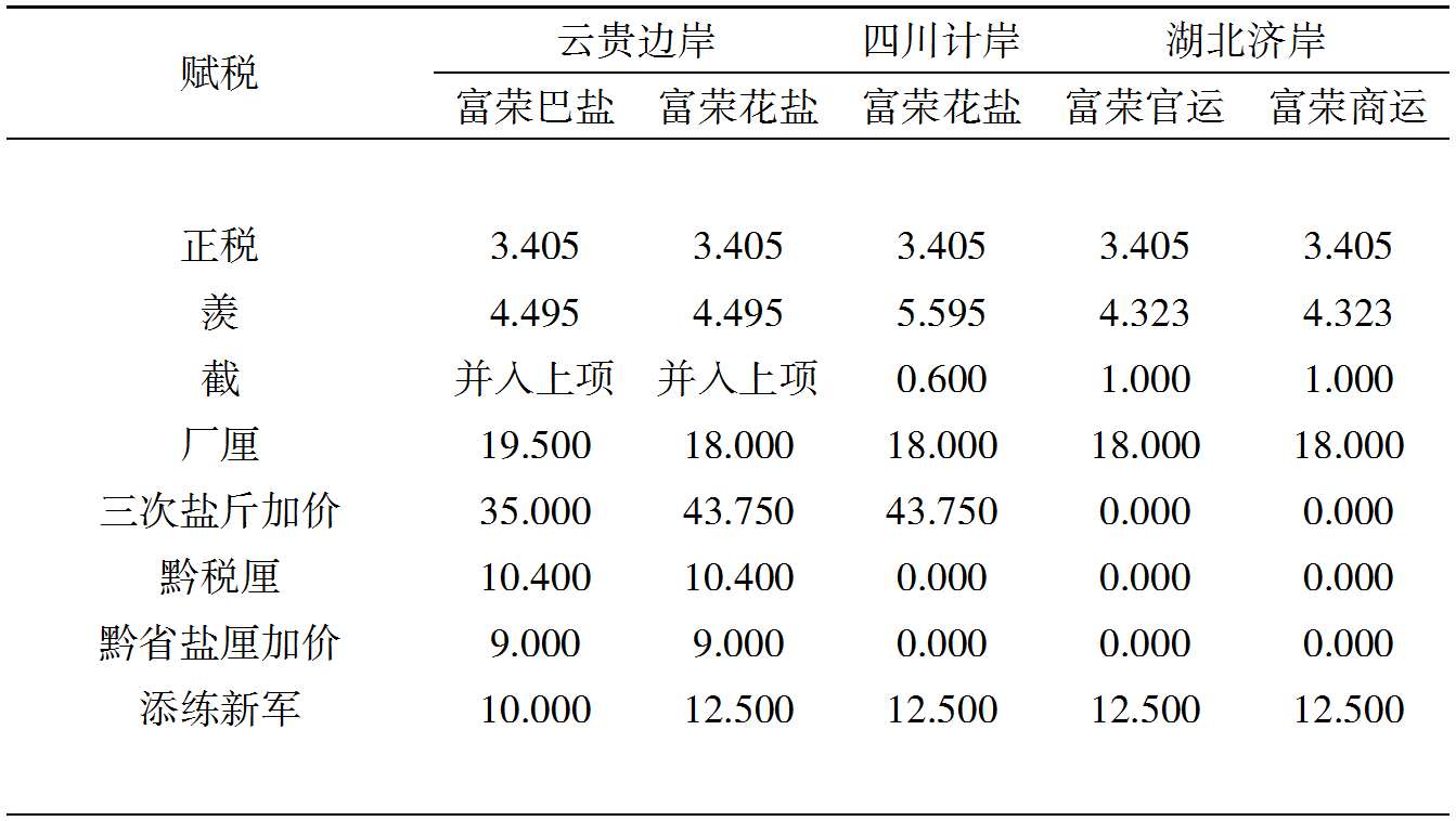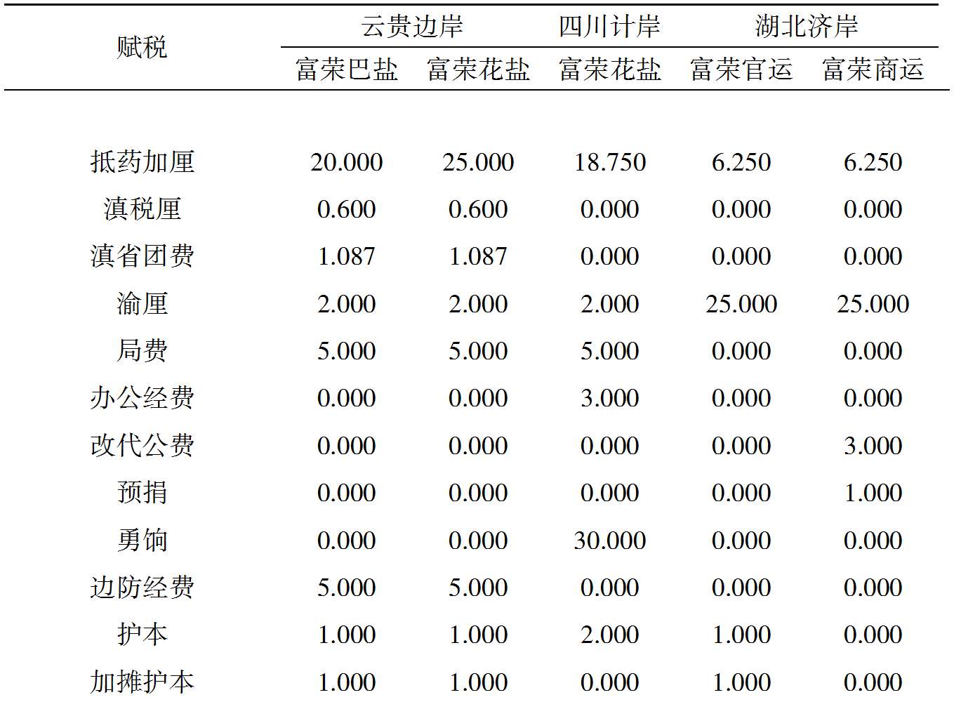 在清朝的最后数十年,需要新的收入以偿付外国赔款、资助新军、支付边防开支、招募乡勇,这导致许多新的赋税添加到了引岸商人所支付的盐价中。 (33) 官运商销制度下向食盐所征收的新赋税,超过一半最初是在1895年出现的,这一年中国在甲午战争中战败后签订了《马关条约》,向日本赔偿2亿两白银。20世纪初的改革辨识出了向川盐征收的25种收费和附加税。 (34) 这些加派对于在不同市场的富荣盐价的影响可见表6.2。