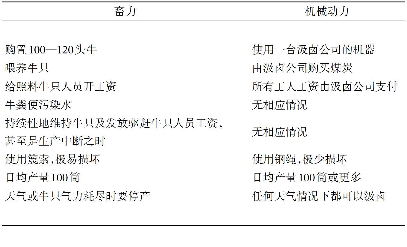 尽管樵甫没有提及,但井户却因此不必再购买和照料牛或骡,他们也不必承担修理和更换机器的费用。如果产量能增加50%或更多,而且除了相对很少的押金外,井户可以省却全部的生产成本,那么与亲自汲卤相比,即便是拿出一半的盐卤,他获得的利润也是相同甚至更多。而且,对于正经受现金流转问题的井户而言——20世纪初的许多井户面临此问题,有了包推,就无需在得到他人购买卤水的付款前,就拿出工资和原料的经费。 (63)
