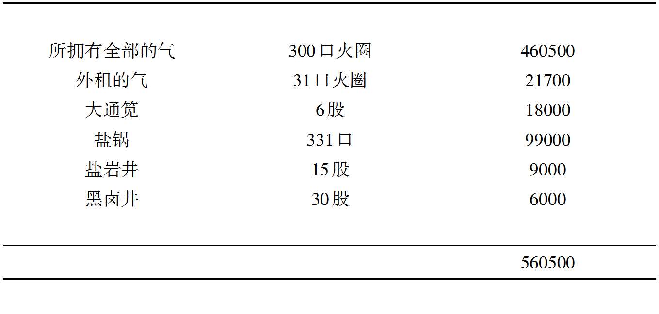 李四友堂的盐井资产也在锐减。在自流井,李四友堂仅有的卤井是盛海井和鸿海井,每眼日均产量仅仅八九十担,而此时盐岩井日均产量为15000担。与李家没有关系的李世泰,拥有盛海井一半的股份,李家则独自拥有鸿海井。在贡井,李家也拥有齐生井三分之一的股份,这眼井机器汲卤,产量要高得多,日产1000多担。李家涉足笕业并拥有数眼高产气井,可以维持一个令人满意的气火盐灶的投资组合。李四友堂利用来自李星桥等人开凿的正龙井的天然气,在1927年煎盐超过了470口锅。