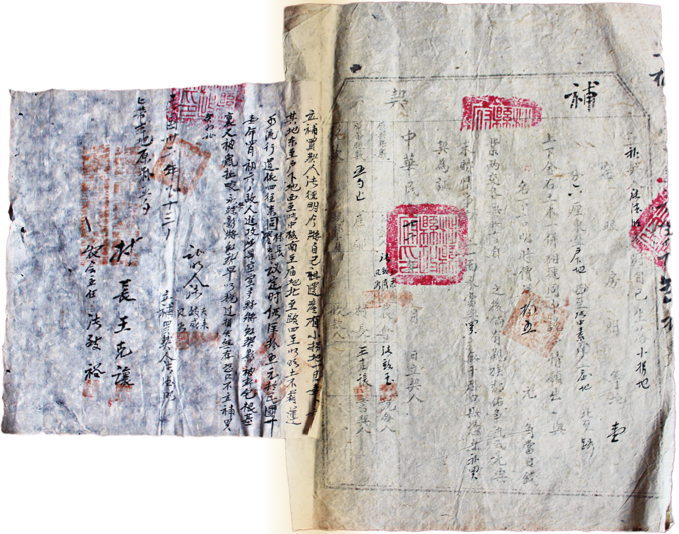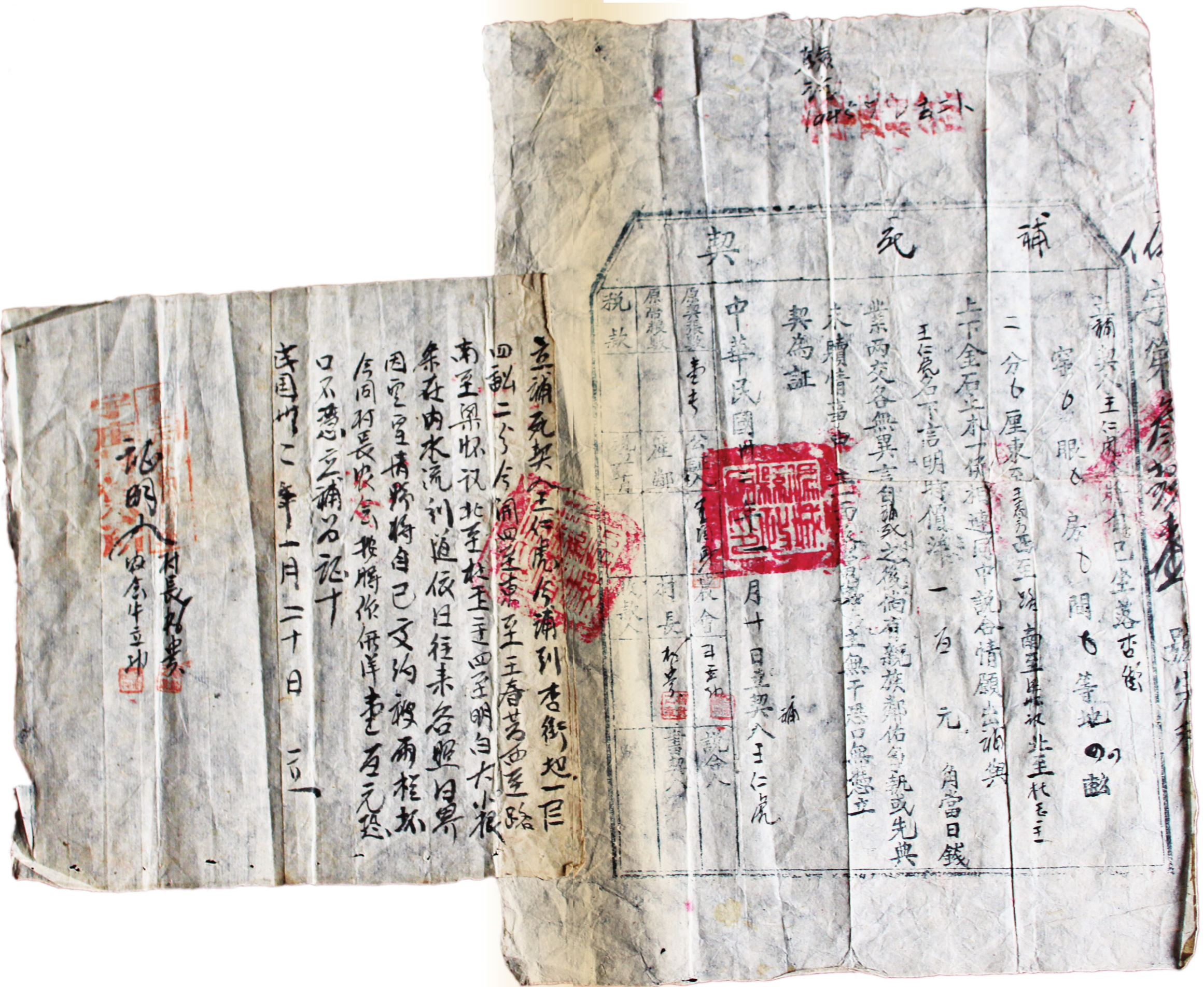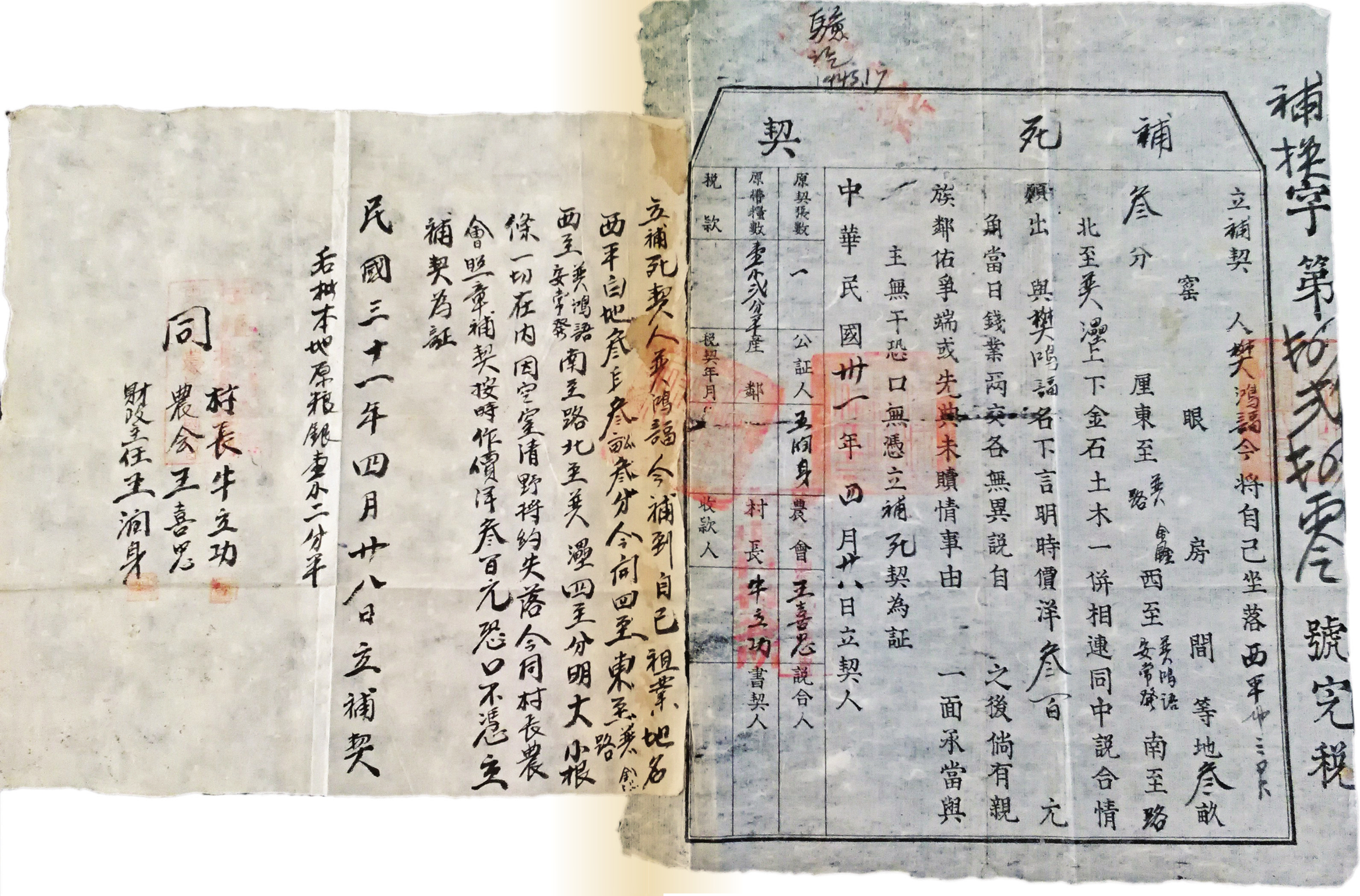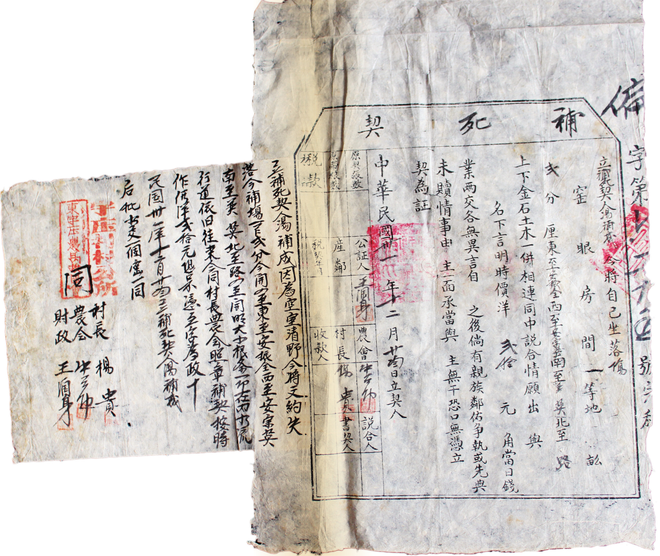 立补死契人王仁虎今补到杏街地一段四亩二分,今开四至:东至王春芳,西至路,南至梁怀议,北至杜玉主,四至明白,大小根条在内,水流行道依旧往来,各照旧界。因空室清野,将自己文约被雨栏(烂)坏。今同村长、农会按时作价洋壹百元。恐口不凭,立补(契)为证。(签押)