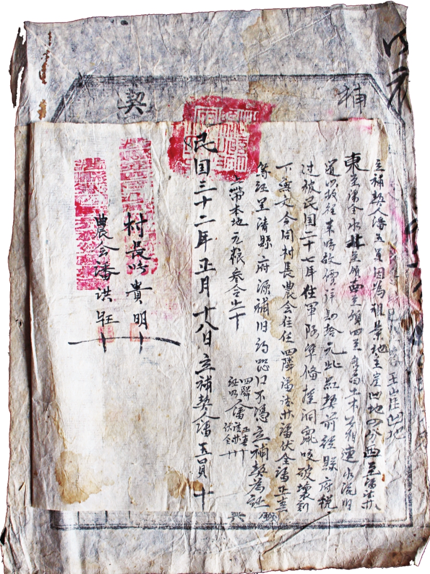 立补契人潘堂的,因为祖业庄房八间,其业东至潘洪旺,西至(此处破损),南至刘老二,北至潘德林,门路通街,水流旧道以故往来,四至开明,原照旧界,言明时价洋壹仟元,此约前经政府税过,被民国廿七年五月廿六日避过五十三军,藏避窑洞鼠咬破坏,现有烂文约。今同村长、农会主任及四邻等证,呈请政府原补契业(约)。恐口不凭,立补契为证。