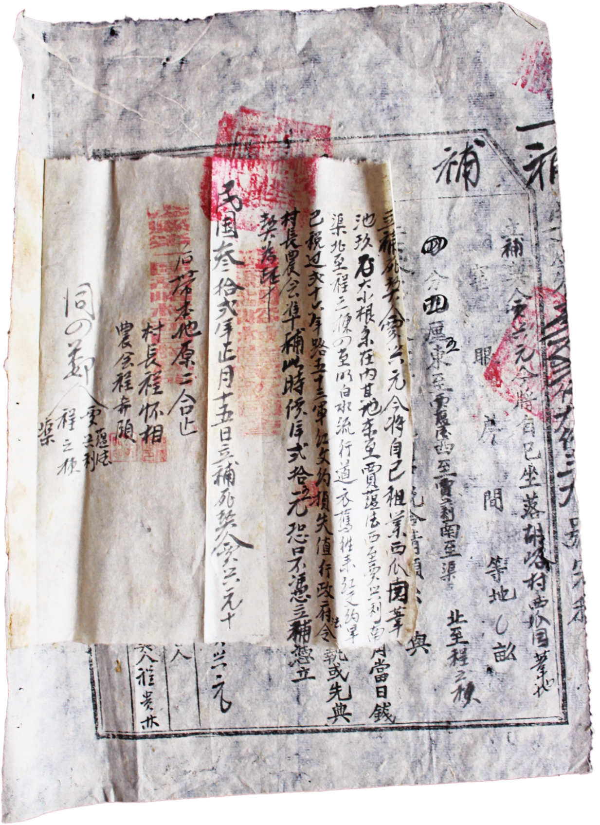 立补死契文约人申立政,今将自己祖业地名上南平地壹段计地弍亩,其地东至李镇法,西至宋积仓,南至宋全福,北至宋积仓,四至明白,根条在内以旧往来,原界今侄产邻申万贵证明确系自业,并向政府税过。契因(民国)二十六年过溃军,将文约埋在土里拦(烂)坏。时请村长、农会盖章,照章补契,决定时价洋壹佰二十元正(整)。(签押)
