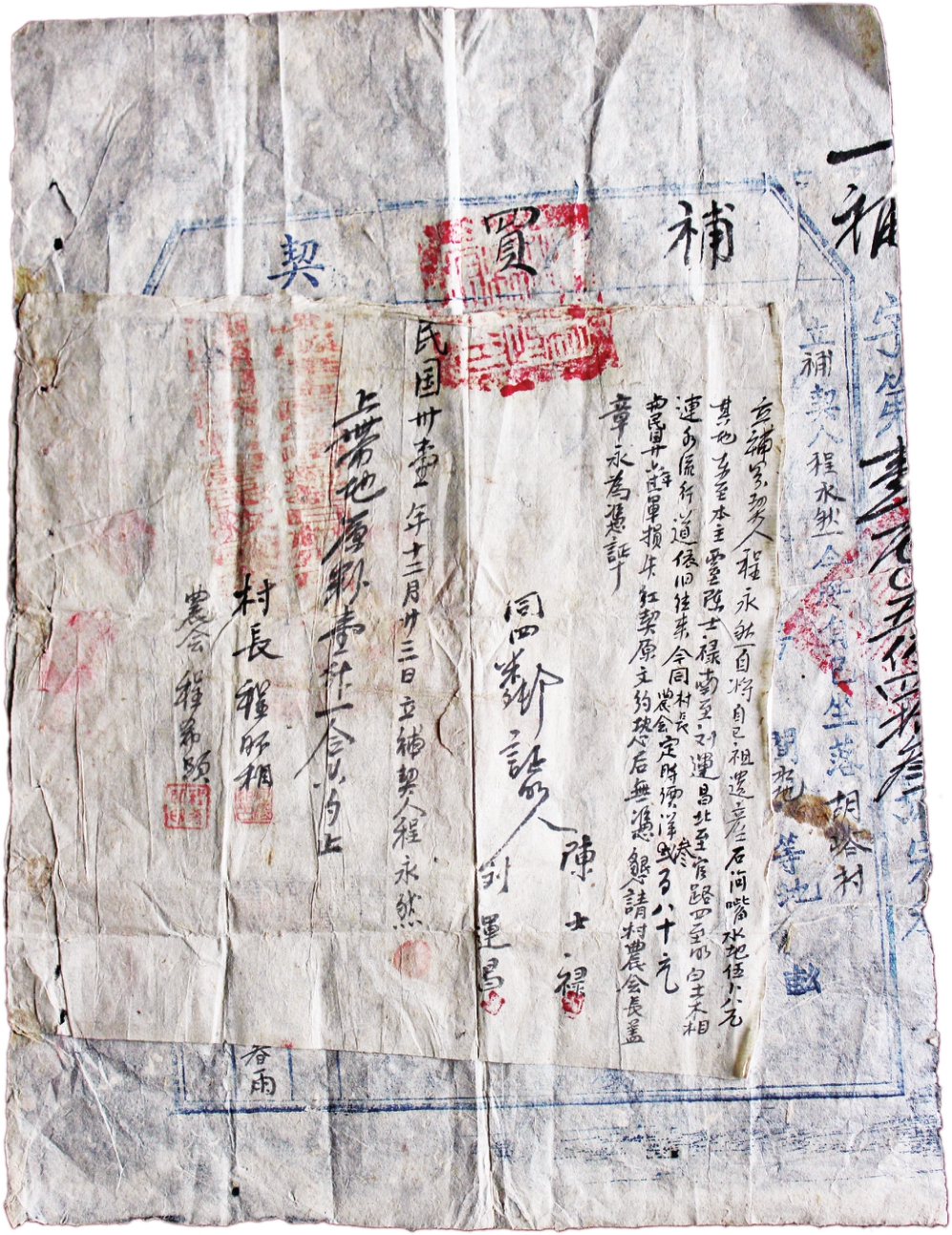 立补契人程学信,今将自己祖遗产下街口苇地壹分六厘,其地东至陈春元,西至王玉荣,南至程学智,北至贾文科,四至以(已)明,土木相连,水流行道依旧往来。今经村长、农会定时价叁拾元。于民国廿六年过五三军将红契原文约失少。恐后无凭,立补契为证。(签押)