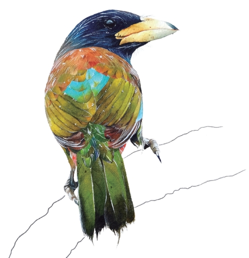 注意,不是啄木鸟,而是“拟”啄木鸟,即这是一种跟啄木鸟有点相近的鸟儿,不常见。其又粗又厚的喙令人印象深刻,但它的喙并不适合用来凿洞,其食物主要是植物的花、果实和种子,此外也吃各种昆虫。