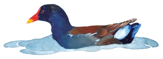 黑水鸡是一种属于秧鸡科的常见水鸟,具有鲜红色的额甲,故俗名“红骨顶”。在公园的河道、湖泊中也常可见到。喜欢沿水生植物边上游泳,主要吃植物嫩叶、幼芽或啄食昆虫之类,有时也会上岸觅食。