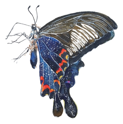 碧凤蝶为全身闪烁着亮丽金属光泽的大型凤蝶,翅展达12 厘米左右。双翅底色为黑色,翅面遍布绿色、蓝色亮鳞,后翅有红色的新月状斑纹。碧凤蝶在中国分布很广,亦为宁波山里最常见的凤蝶。碧凤蝶很爱吸水,访花的场景反而少见。