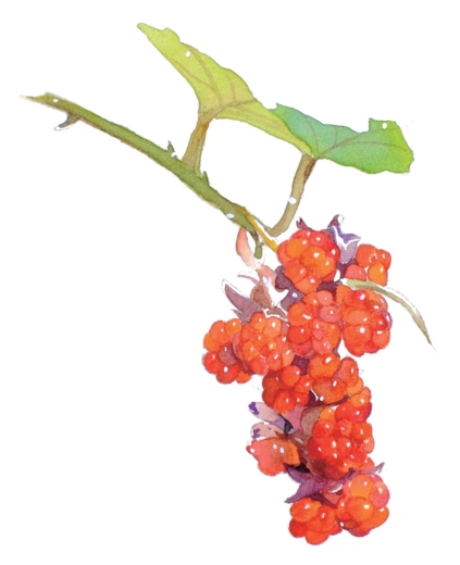 蔷薇科悬钩子属的藤本植物,山路边很常见,果期深秋,可食,酸甜可口。鲜红的果实为一粒粒红珠子聚成球形,成串挂在枝叶间,就像是一串串葡萄。