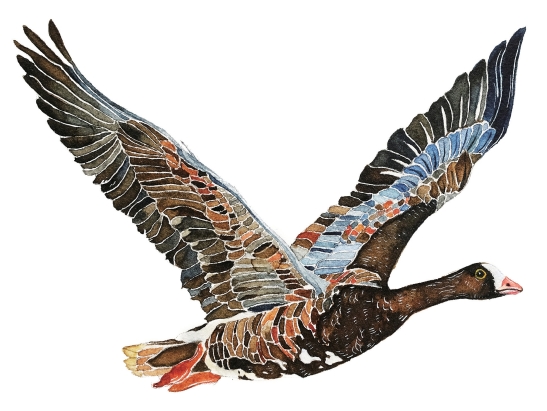 小白额雁为华东罕见冬候鸟,多见于海滨湿地。其外形和相对常见的白额雁相似,但体形较白额雁小,额部白斑却较白额雁大,一直延伸到两眼之间的头顶;另外,小白额雁眼周为金黄色,而白额雁无金色眼圈,这也是两者的显著差别。