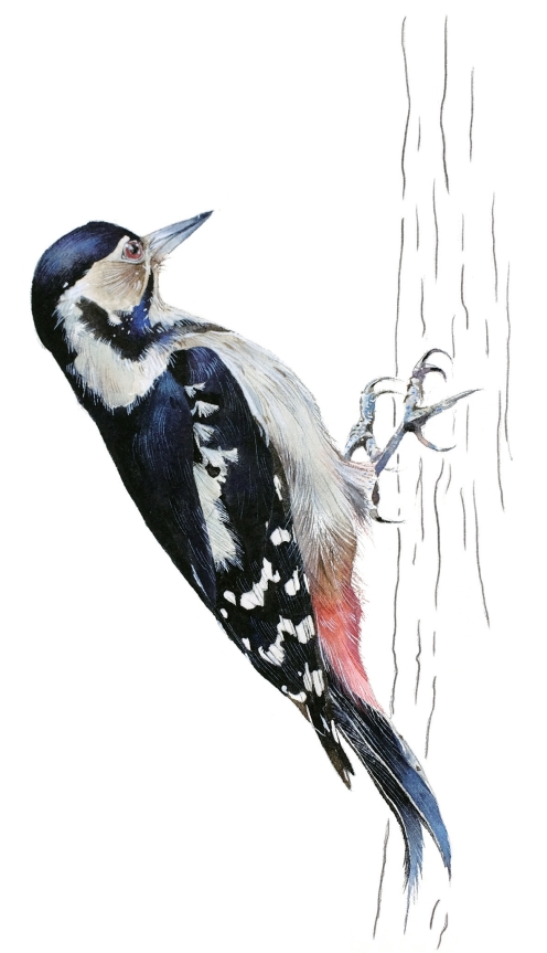 大斑啄木鸟可谓典型的啄木鸟:黑白红三色完美搭配,拥有凿子一般坚硬的喙,善于在树干上凿洞觅食;坚韧的尾羽可像支柱一般顶住身体,配合锐利的钩爪,使得它不仅善于攀缘,而且可以稳稳地“坐”在笔直的树干上而不会滑落。