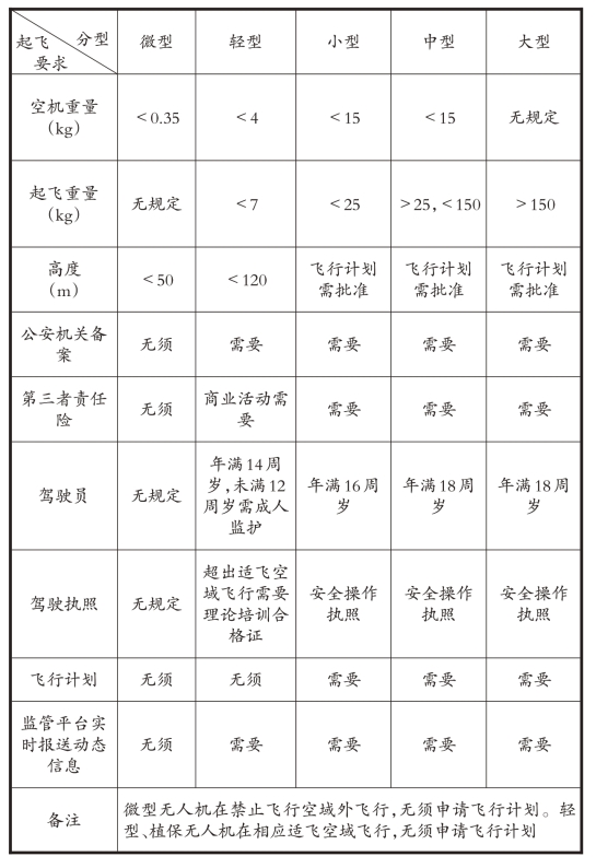 五型:按飞行安全风险,以重量为主要指标,结合高度、速度、无线电发射功率、空域保持能力等性能指标,将民用无人机分为微型、轻型、小型、中型、大型,具体见表1-1。