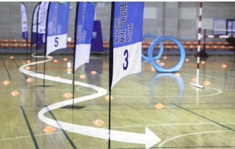 就像常规的无人机赛车比赛场馆一样,迷你无人机赛车比赛场馆分为大的直线区、拐角区、大门和激流回旋区。有一个圆锥体,跟着这个碟形圆锥体飞,比其他任何人都快。