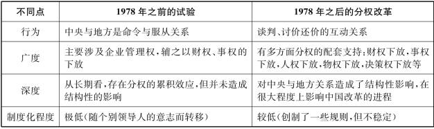 如前文所述,从长期的趋势来看,自新中国高度集中的体制确立起,中央与地方的财政关系就总体上朝着分权的方向发展。因此,20世纪80年代的分权改革只是这一整体趋势中的一个环节。但是,20世纪80年代的分权改革,无论是在广度上,还是深度上,都非先前的放权试验所能比拟。1978年之后的分权与之前的放权有着很大的不同,改革前的放权只不过是计划体制的内部调整,权力的下放和上收概由中央政府决定,即使是向地方政府放权,也并不改变地方政府完全从属于中央政府的关系。改革之后的分权却是和经济的市场化相伴而行的,地方政府开始有了十分明确、独立的经济利益和行为目标。在整个改革的进程中,地方政府在自身利益的驱动下,积极发展本地经济,对于推进改革和促进经济增长起到了非常积极的作用。[34]而且,这场改革的后果不仅仅是促进了经济发展,它也从根本上改变了中央与地方关系的属性,从而为中国政治权力结构带来了新的因素(见表3.3)。