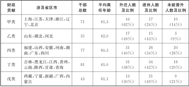 尽管影响省区市领导政治前途的因素非常多,但如表4.2所示,仍然能够发现省区市领导的政治流动与其任职省区市的财政贡献存在较明显的相关性。