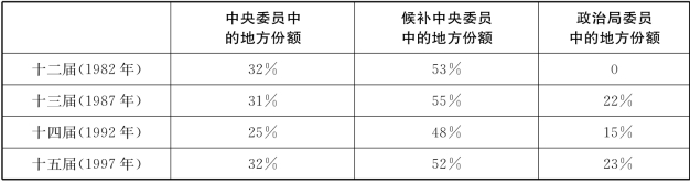 在中国的传统政治中,中央政府化解地方力量的一个重要方法就是将地方势力吸纳至“京城”,从而可以直接加以约束。许多学者已经注意到,在20世纪80年代的中央与地方关系中,确实存在着一定的中央对地方的吸纳机制,最突出的例子就是党的中央委员会中人员构成的比例明显向地方领导倾斜。在党的组织网络中,中央委员会具有非常重要的地位,它由每五年一次的全国党代表大会选举产生,共由170—210名的中央委员及100—150名的候补委员组成。这些委员与候补委员容纳了中央、地方及军队部门的领导,包括各领域、各民族中的精英人物。中央委员会的一项重要职能是选举中央政治局委员,并形成由不超过10人组成的政治局常委会,从而产生国家最重要的政治决策中心。