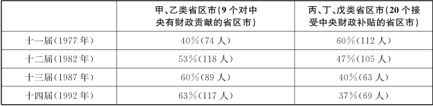 应当指出,中央委员籍贯地分布的这种变化存在许多其他的原因。但它也能说明一点,即改革开放之后,中国政治生活的重心已由强调政治斗争向经济发展转变。在这种情况下,越是经济发达且对国家财政贡献大的地区,就越会得到中央的重视。同时,这些地区对整个国家在经济及财政上的更大影响,使得中央的政治资源不得不向这些地区倾斜。中央吸纳机制中的这种政治资源的不平均分配同晋升机制中所表现的情形具有相似性,它们都反映了中央的目标模式是通过一种交换的方式给予这些地区以更多的政治资源,从而换取地方的财政支持。当然,这也可以视为中央通过吸纳机制加强对财政资源丰富的地方的约束与管理。