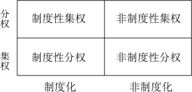 依照中国的国情,在现代化模式的选择与演进中,既可以找到集权的理由,也可以找到分权的理由。但问题的重点也许并不在于权力的集中与分散本身,而在于集中与分散的方式。如果以制度的视角来看,中央与地方的权力结构可分为四种类型:制度化分权、制度化集权、非制度化分权、非制度化集权(见图4.3)。所谓的制度化集权或分权,指的是权力过程规则化、透明化,使权力主体及权力所指的对象均能形成合理的预期;非制度化的集权与分权,则体现为权力的集中与分散并非由某一套透明的规则所确定,而只是权力主体对权力及权力技巧的发挥与运用。