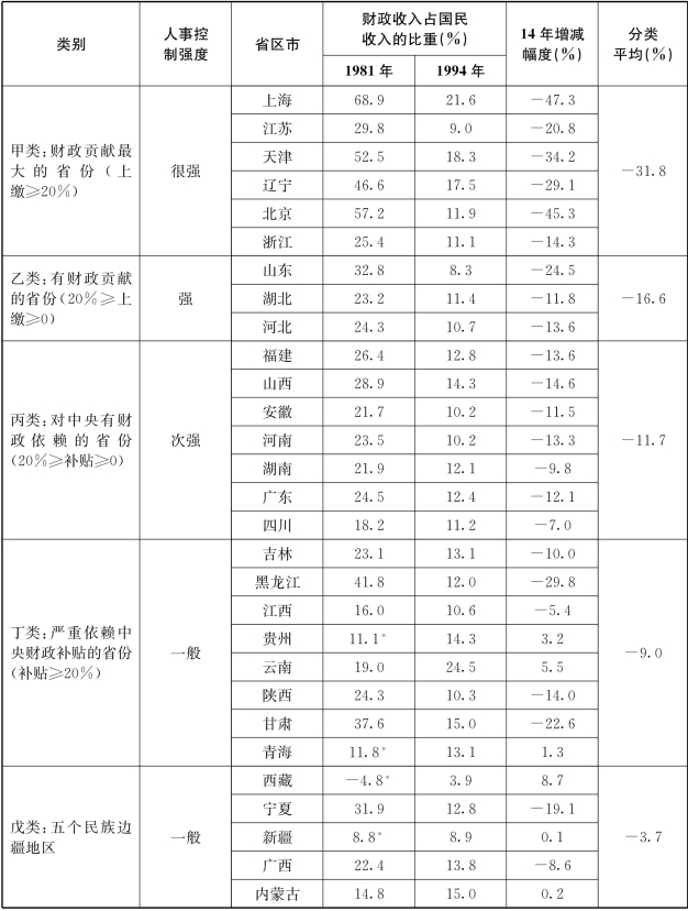 资料来源:关于地方对中央的平均财政贡献的计算及类型划分,详见第四章内容。关于财政收入占国民收入的比重,源自各省、自治区、直辖市1993年的财政统计资料。带*的数据表示不是当年的数据,而是能够收集到的最早年份的数据,如西藏的数据是1985年的数据。详细数据见附录1、附录2内容。