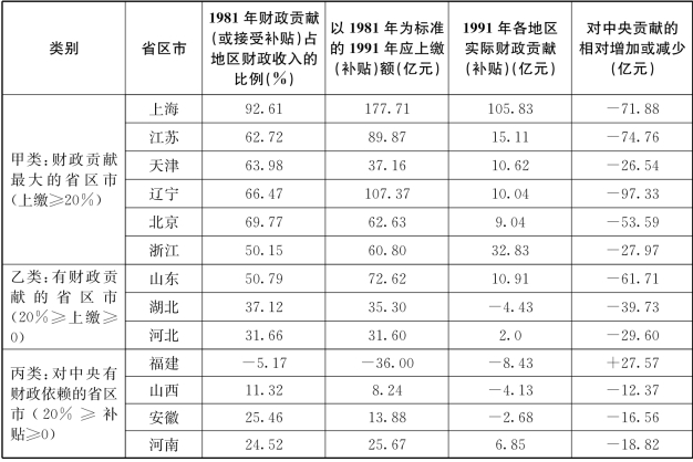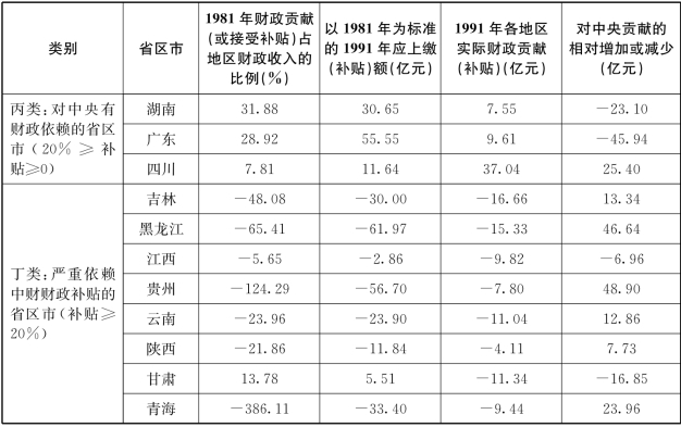 需要进一步弄清的是不同类型的省区市对中央财政贡献下降的差异。此处以1981年各地向中央上缴(或接受补贴)占当年本省区市财政收入的比例为标准,如果假定在1991年以1981年同样的比例对中央进行财政上缴(或接受补贴)则会发现,对中央财政贡献最大的9个省区市,即财政资源最丰富的省区市,对中央的实际贡献仅仅为其应该贡献的28%。与此同时,接受中央财政补贴的省区市对中央财政补贴的依赖度却在逐渐降低。如果以1981年的补贴标准,丙类和丁类15个接受补贴的省区市在1991年实际接受的补贴仅仅为应当接受补贴的38%。