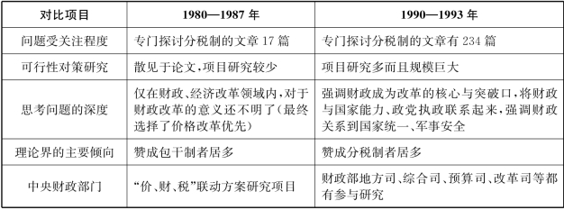 综上所述,可以得出两点结论:(1)对财政体制的问题及其改革的认识是随着现实的发展不断深化的。(2)到1986年为止,无论是研究者还是决策者,无论是主张分税制者还是主张包干制者,对于分税制本身并没有太深入的理解,对于中国财政问题的根本原因也没有确定而一致的意见。这种智力累积的状况远不能同1993年相比,因而决策者不可能像1993年那样获得智力支持。与此相应,也不可能具有对制度变革的信心。当然,如果要证明这一点,就必须对1987—1993年关于分税制的知识积累的进展情况做出说明,从而通过对比得出结论。