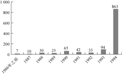 分税制是逐渐走进国内研究者视野的。此处,研究者群体不仅仅是指大学或专门的研究机构,也包括许多政府财政部门的实际工作者。通过对1982—1994年全国主要期刊的检索统计发现,在1978—1986年,仅有4篇以分税制为主题的文章。1987年之后,主题中含有分税制三个字的文章逐年增多,到1992年达到33篇,到1993年则有94篇,而到了分税制全面推行的1994年,研究分税制的文章一下子激增到863篇(见图6.3)。这种数量的变化显然和中央与地方财政体制改革的进程是直接相关的,可以认为,随着财政权力的日益分散化,中央与地方间财政矛盾逐渐深化,因而更多人转向分税制来思考解决的途径。从这方面讲,由分散化带来的压力刺激了知识的产生,并为以后的分税制改革提供了必要的智力基础。