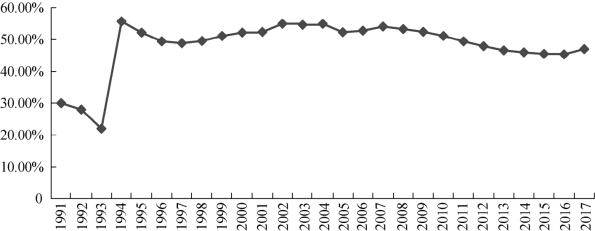 图8.3 中央财政收入占全国财政收入的比重(1991—2017年)