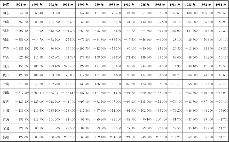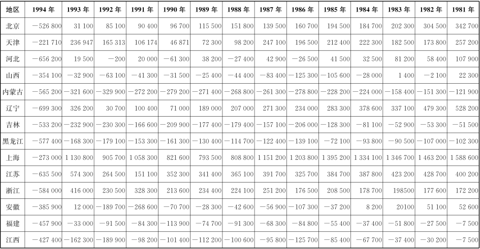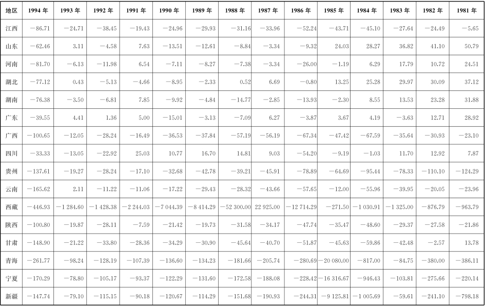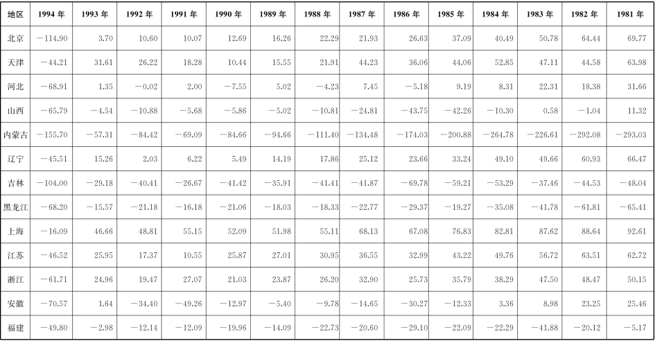 [2]因为缺乏直接资料,因而根据附录1、附录2中的数据推算出。地方财政支出与收入之差可视为地方政府向中央上解额(地区间转移额),或从中央得到的补助额。如果地方向中央上解收入,则转移额为正,如果地方从中央接受补助,则转移额为负。