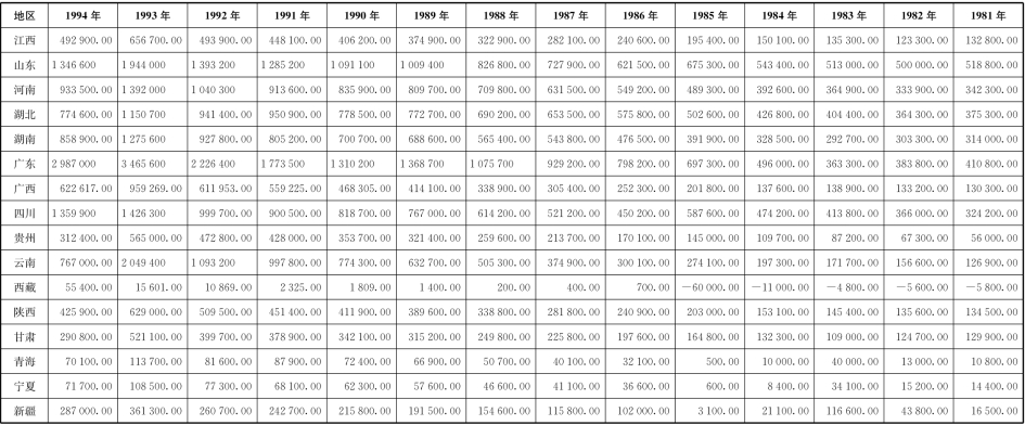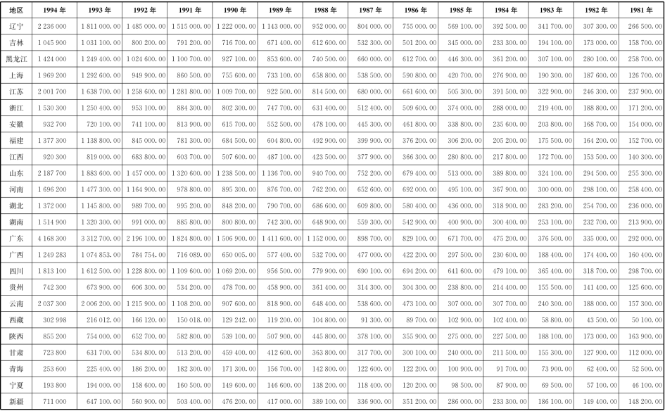 [1]资料来源:本表中财政收入为地方政府负责征收的本级收入,不包括其他调入资金。1981—1993年数据来自国家统计局国民经济综合统计司编:《新中国50年统计资料汇编》,中国统计出版社,1999年版,第147页及之后各省区市“财政收支额”内容。1994年数据来自楼继伟主编:《新中国50年财政统计》,经济科学出版社,2000年版,第85页。