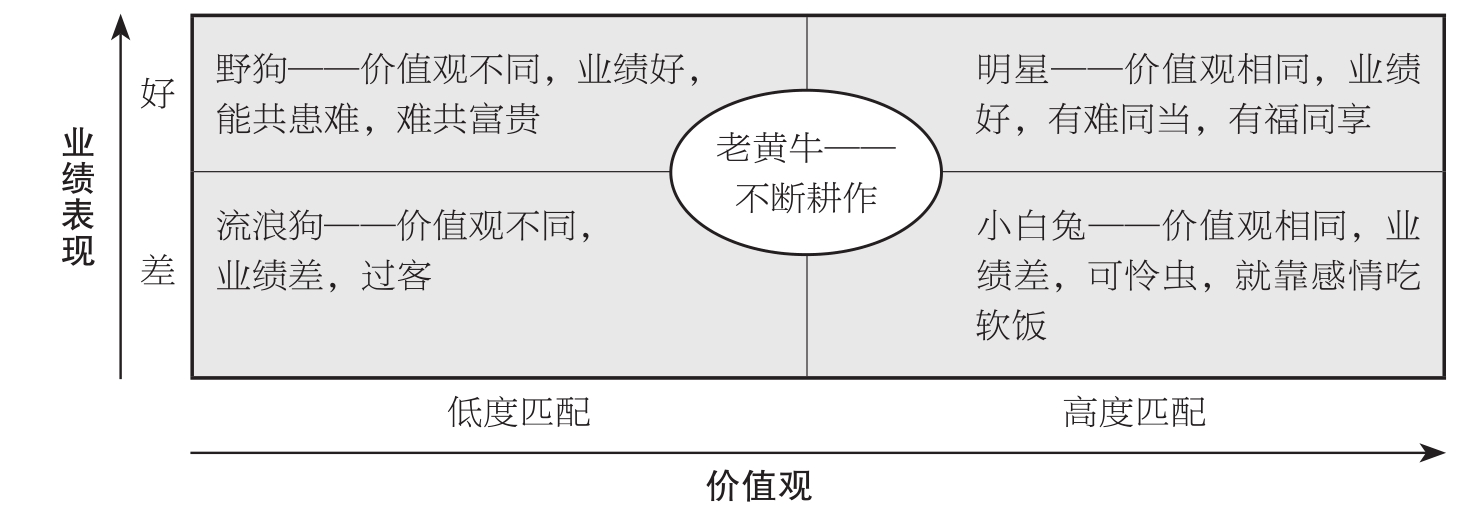 我们把任何一个团队中的人按上述两个维度(价值观和业绩)进行划分,必然可以把每一个人划分为上述五个类型中的一种,每一种人的命运也就注定了。需要注意的是,价值观也可以划分为更多的维度,比如正直、可靠、勤奋、坚毅等各类细分指标;同理,业绩表现也可以用企业中的KPI或者类似指标进行进一步划分。对于不同的企业来说,在创业早期往往会形成各自不同的行为习惯和风格,这些潜在的、不成文的规则正是其文化、价值观的体现,正是“臭味相投”的体现。同样,在企业发展的不同阶段,价值观也不是一成不变的。