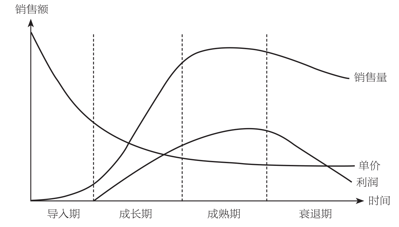 行业(产品)生命周期是指行业(产品)从产生到完全退出社会经济活动所经历的整个过程,主要体现为四个发展阶段:导入期,成长期,成熟期(也可叫“高峰期”),衰退期。我们可以用图3-1行业(产品)生命周期曲线图来表现行业(产品)生命周期的各阶段特征,曲线图的横轴代表的是时间,纵轴代表的是行业(产品)的销售额。