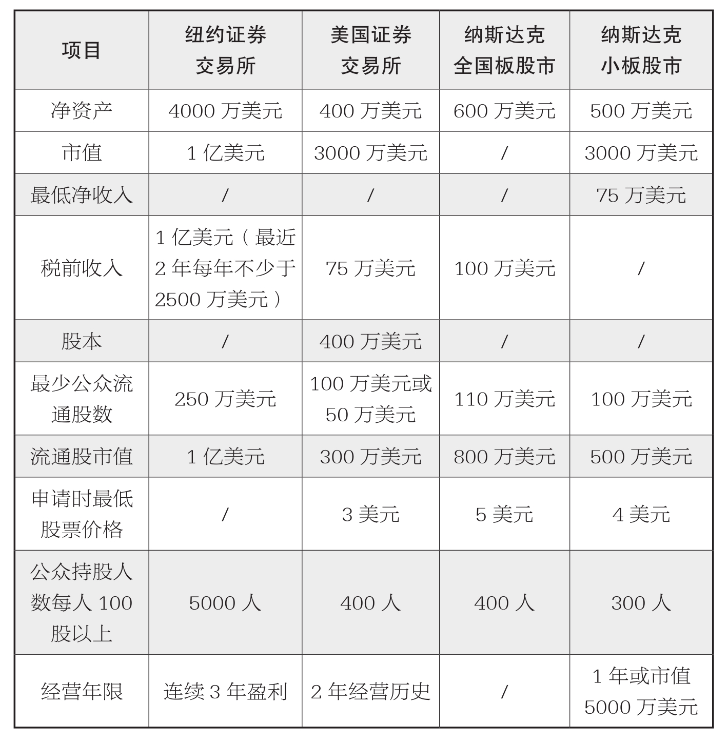 美国拥有现在世界上最大的、最成熟的资本市场,股票总市值几乎占了世界的一半,季度成交额也占了全球的60%。美国的证券市场除了纽约证券交易所(NYSE)和美国证券交易所(AMEX)两个证券交易所之外,还有纳斯达克(NASDAQ)这个世界上最大的电子交易市场,还有柜台电子公告榜(OTCBB)等柜台交易市场。企业只要符合其中任何一个市场的上市条件,就可以向美国证监会申请登记挂牌上市。因此各种各样的企业都有很大可能在美国资本市场找到对应的板块。