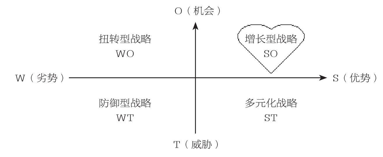 SWOT分析法中的S(strengths)代表优势,W(weaknesses)代表劣势,O(opportunities)代表机会,T(threats)代表威胁。S和W是企业的内部因素,O和T是企业的外部因素。需要特别注意的是,分析优劣势时需要从整个价值链的每个环节上将企业与竞争对手做详细的对比,要从客户的角度来判断自身的优劣势,而不是站在企业自己的角度上,因为所谓优劣势,都是比较以后的结果。经过分析对比后,企业都会处在下图四个象限中的其中一个象限里,处在不同的象限就要选择与之对应的战略。处在SO(增长型战略)中的企业是投资人的最爱。