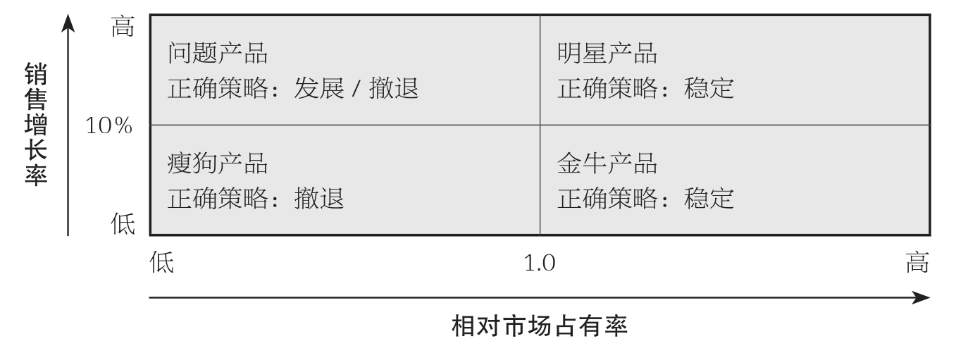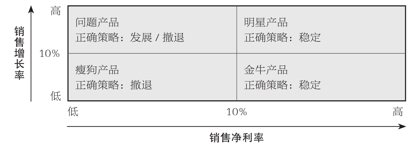 纵坐标为销售增长率,用企业某产品近两年市场销售额增长的百分比来计算,体现的是产品所在市场的发展趋势。操作中通常以10%为分界线,10%以上为高增长率,10%以下为低增长率。