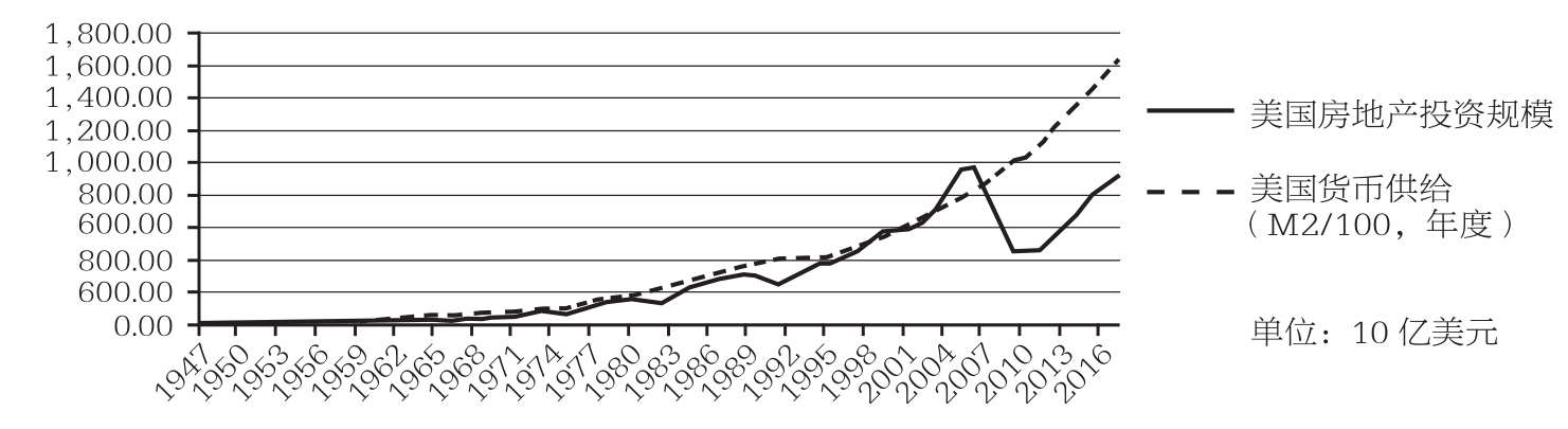 《美国次贷危机产生的原因》一书大致提供了核心的解释,那就是美国政府采取了错误的住房激励政策,让中低收入美国居民能够拥有自己的住房。为了实现上述目标,美国国会在1977年通过了《社区再投资法案》督促银行等金融机构向经济能力较差、风险较高的私人或是商业机构发放房地产抵押贷款。这无疑极大地催生了新的需求,而这类需求在之前的178年间是不能转化成实际需求的。美国政府通过上述逼迫银行提供贷款的方式增加了货币,而美国银行为了规避这些低收入群体坏账风险又将这类住房抵押贷款包装成资产证券化产品后在全球销售,这样即便是坏账,受损失的也是全球投资者,美国人却由此享受了长达几十年的住房改善和经济增长。图9-7是美国货币供给和房地产投资的走势图,从中可以发现货币政策对房地产投资的显著和一致影响。在2008年美国次贷危机之后,美国为了提振经济继续保持了货币宽松政策,其房地产投资也因此被强力拉回增长通道。