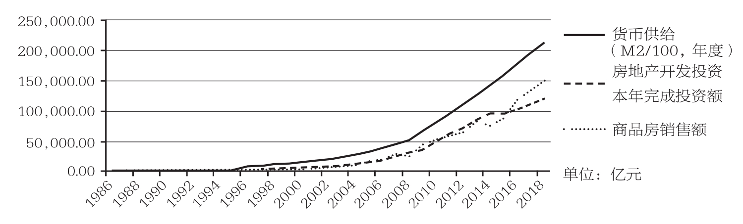 那中国的房地产市场和周期是怎样的呢?中国自1984年进行住房商品化改革开始,房地产投资开发额随之不断增长,自1986年至2018年整整32年间一直呈现快速上升趋势,并没有表现出18—20年的库兹涅茨周期。(见图9-8)
