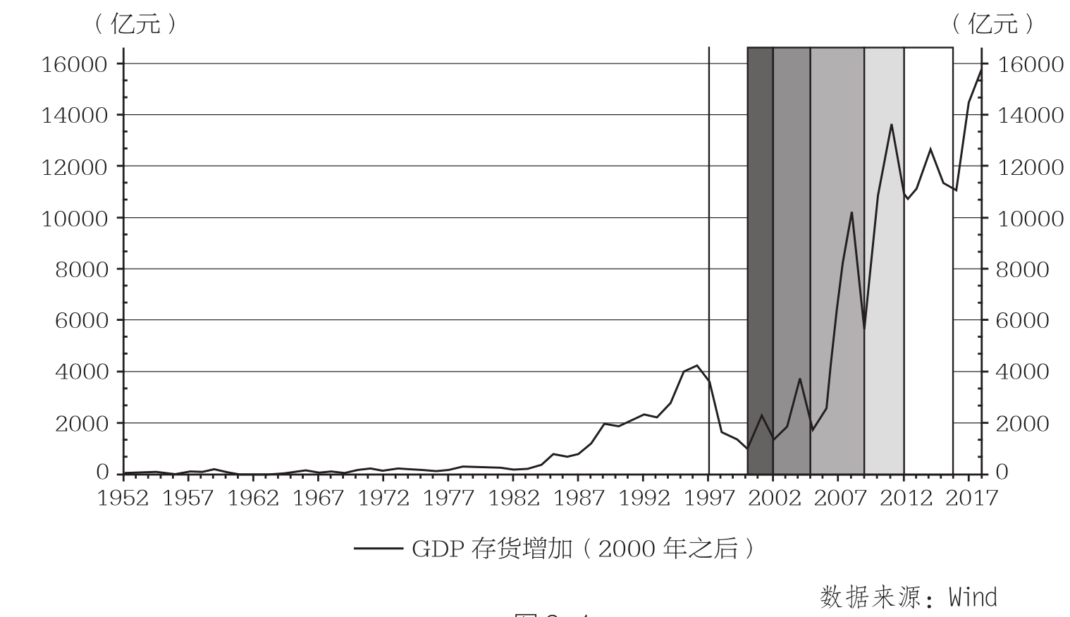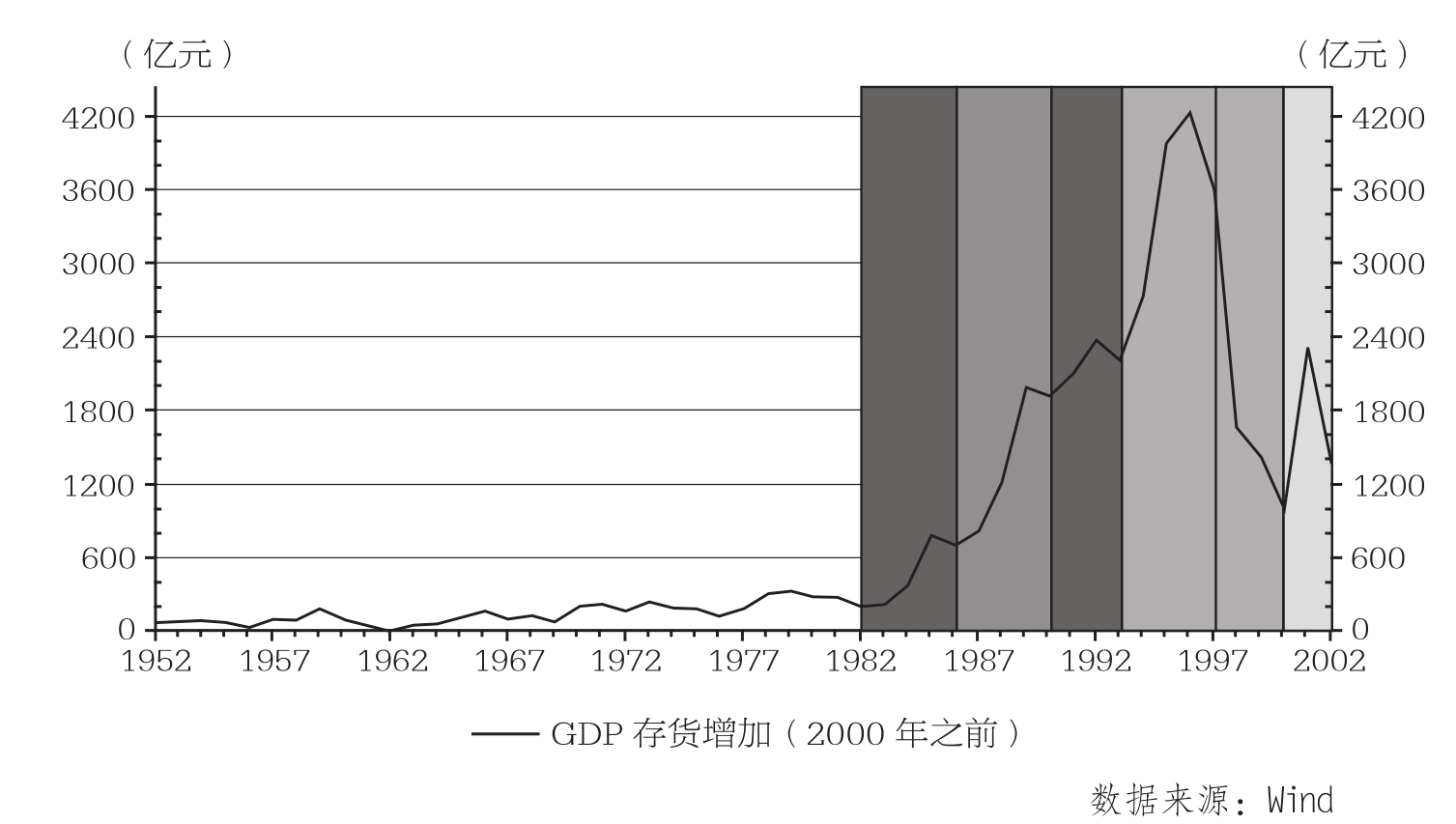 2000年以前,中国大陆在1982—2000年整18年间有4次较为显著的存货周期,平均长度为4.5年,其间最长的一次为7年(1993—2000年),其间发生了1997年亚洲金融危机。从图9-2可以看到,在1997年存货增加额发生了显著加速下滑并在1998年和1999年进一步恶化。