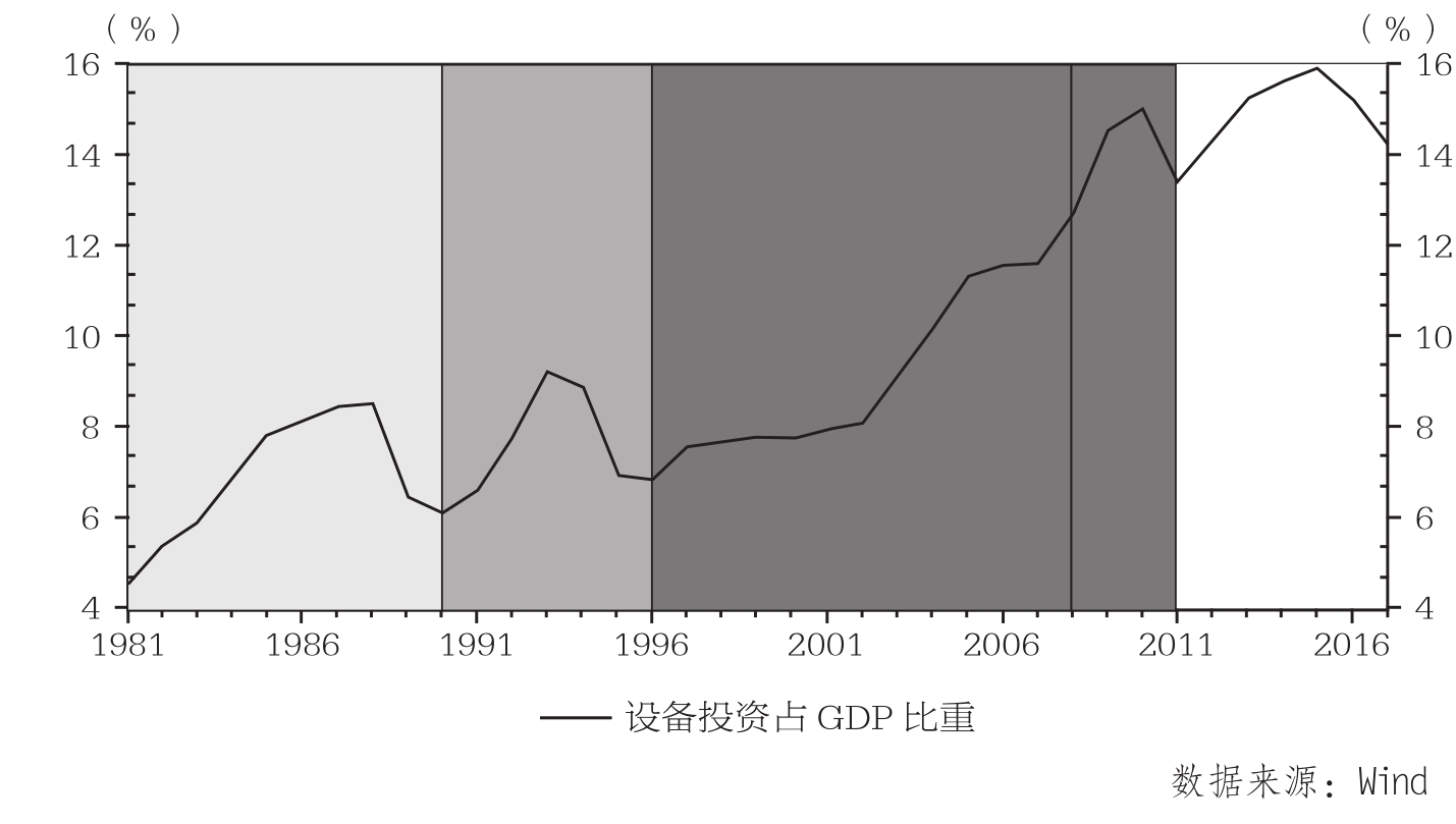 从图9-5可以看出使用设备投资占GDP的比重指标得出的周期数量是3个完整周期和一个不完整周期,完整周期的平均长度是10年。第一个完整周期是1981年至1990年(9年),第二个完整周期是1990年至1996年(6年),第三个完整周期是1996年至2011年(15年,其间由于经历了2008年全球金融危机,中国实施了4万亿元的基建刺激计划,因此可以看到在2009—2010年设备投资占GDP的比重出现了显著上升的情况,可见财政政策对经济的巨大影响)。2011年至2017年是一个不完整周期,如果按平均10年的周期长度来预测,第四个周期将在2021年结束;如果按最短的6年来预测,第四个周期在2017年已经结束;如果按最长的15年来预测,第四个周期将在2026年才会结束。