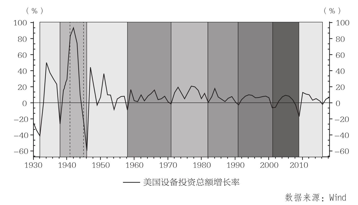 我们统计美国设备投资总额的增长率指标可以发现(见图9-3),自1932年至2016年间,美国设备投资增长共经历了9个周期,平均长度为9.33年,最短的6年,最长的约13年。1932—1938年期间和1938—1946年期间波动极其剧烈,1946—1958年期间较为剧烈,其余周期内波动相对比较平稳。