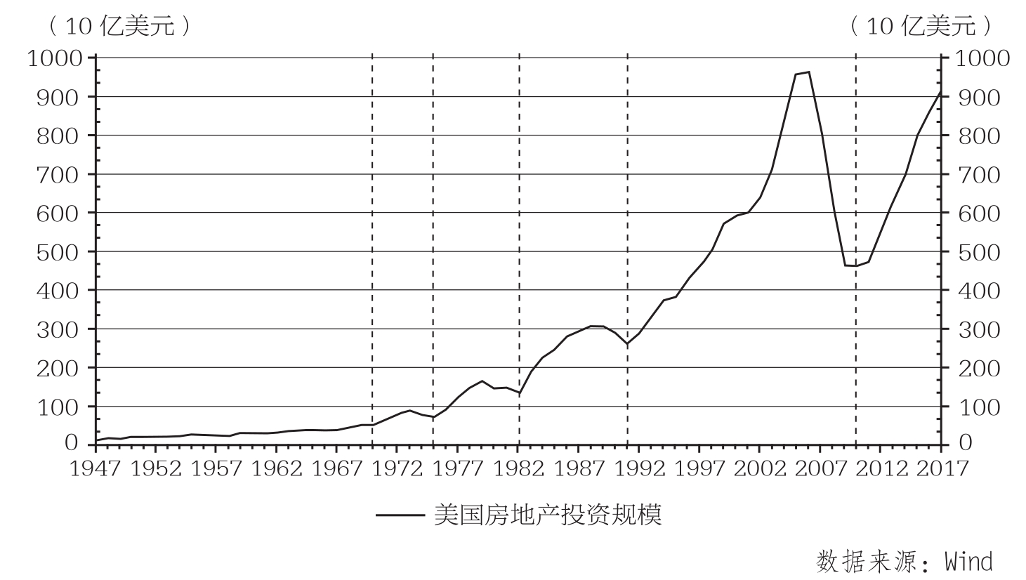如果说在1973年之前对美国房地产周期的主要影响因素是人口,那么从1971年之后影响因素就有了新的变化,因为自此以后货币政策扮演了越来越重要的作用。我们统计自1947年至2017年间美国房地产投资数据后发现,在1970年之前整个房地产投资规模和之后处于不同的数量级,从1970年开始至2006年美国房地产投资规模开启了疯狂发展的模式,直到2006年次贷危机开始显现,2008年次贷危机席卷全球。