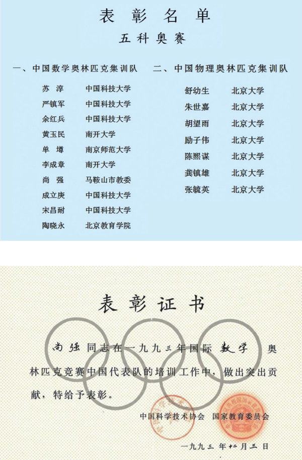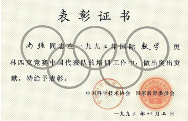 1993年数学家单墫教授又把我推荐给国家奥林匹克队总教练杨路教授,我非常荣幸再次担任国家队几何教练。那年参赛的国家队六名选手全部获得金牌,我再次得到国家嘉奖!