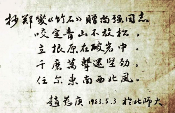 1983年,我初步编出《平面几何解答》一书。当我携带书稿信心满满地前往北京师范大学探访梁绍鸿教授时,梁教授已经逝世。怅惘之余,梁教授夫人介绍我找到了大数学家赵慈庚教授。我兴致勃勃、恭恭敬敬双手递上书稿给赵教授,他没有看就放在一边,开口说:“梁先生已经攻克了这些难题,之所以没有公布,是为了激发青年数学爱好者的兴趣。你花太多时间来研究平面几何是没有大前途的,数学家的研究应该着眼于未知的领域,欧几里得在两千年前编了《几何原本》,把平面几何体系初步建立起来了,又经过笛卡尔、罗巴切夫斯基、黎曼、克莱因、希尔伯特等人的发展,已臻完善。你虽然做的是重复研究,但是反映出你有一定水平,也算是传承上的集大成者。建议你以后拓宽数学方向,选择数学教育研究。”为鼓励我,赵教授欣然提笔在明信片上抄了一首郑板桥的《竹石》诗送给我: