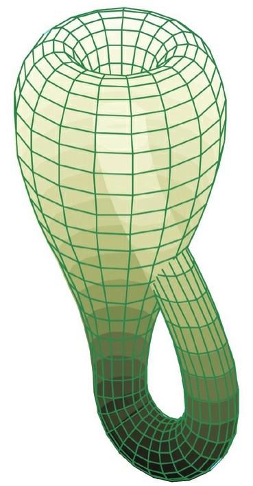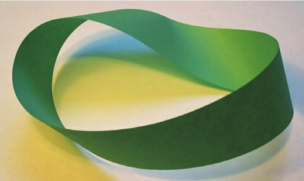 又如,一般人们的常识是——一张纸有两个面,一只虫子要想从纸的一面不穿过平面,绝对到不了另一面。但是“莫比乌斯带”(图1-2-1)的出现,却打破了人们的常识。因为它只有一个面,是单面的。同样,在三维空间图形中那个“克莱因瓶”,不分里外,只有一个表面。这些奇怪的现象和图形,引起过人们极大的研究兴趣。人们认为这些奇怪的图形,具有新奇之美,美到令人感觉不可思议。
