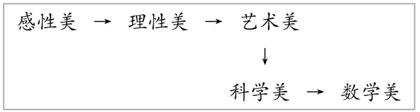 这只是大概的关系。其实,感性美和理性美之间,是不能完全分割开来的,何况是艺术和科学、科学和数学,更不能分割开来。它们的关系是“你中有我,我中有你”,互相紧密联系在一起。只是因为数学美的抽象和深奥,需要深入发掘和研究,我们才把它从科学美中突出出来作为重点。至于它们之间的关系,后面各章还将详细论述。